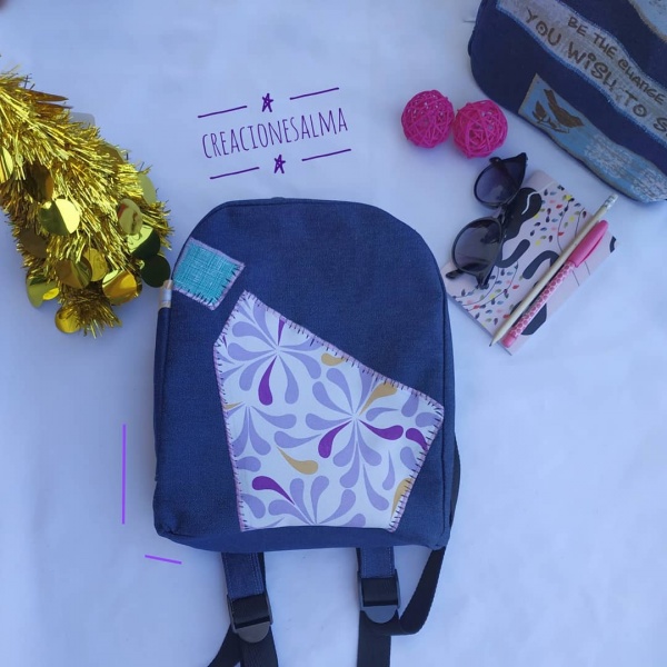 MiniMochila confeccionada en jens. De diseño.  Super original su cierre de seguridad en su espalda. cuenta con un bolsillo abierto exterior,con ojal para pasar los auriculares. En su interior cuenta con un bolsillo con velcro,de buen tamaño.
